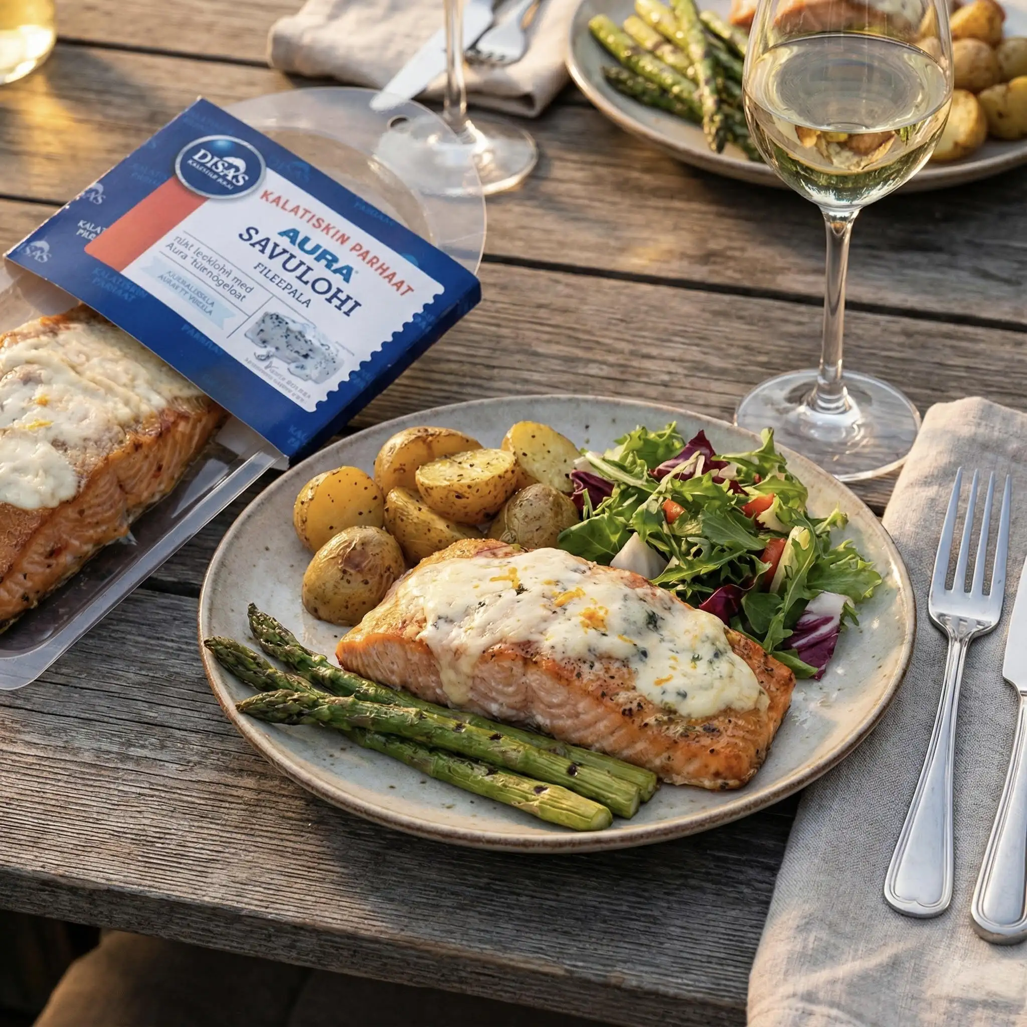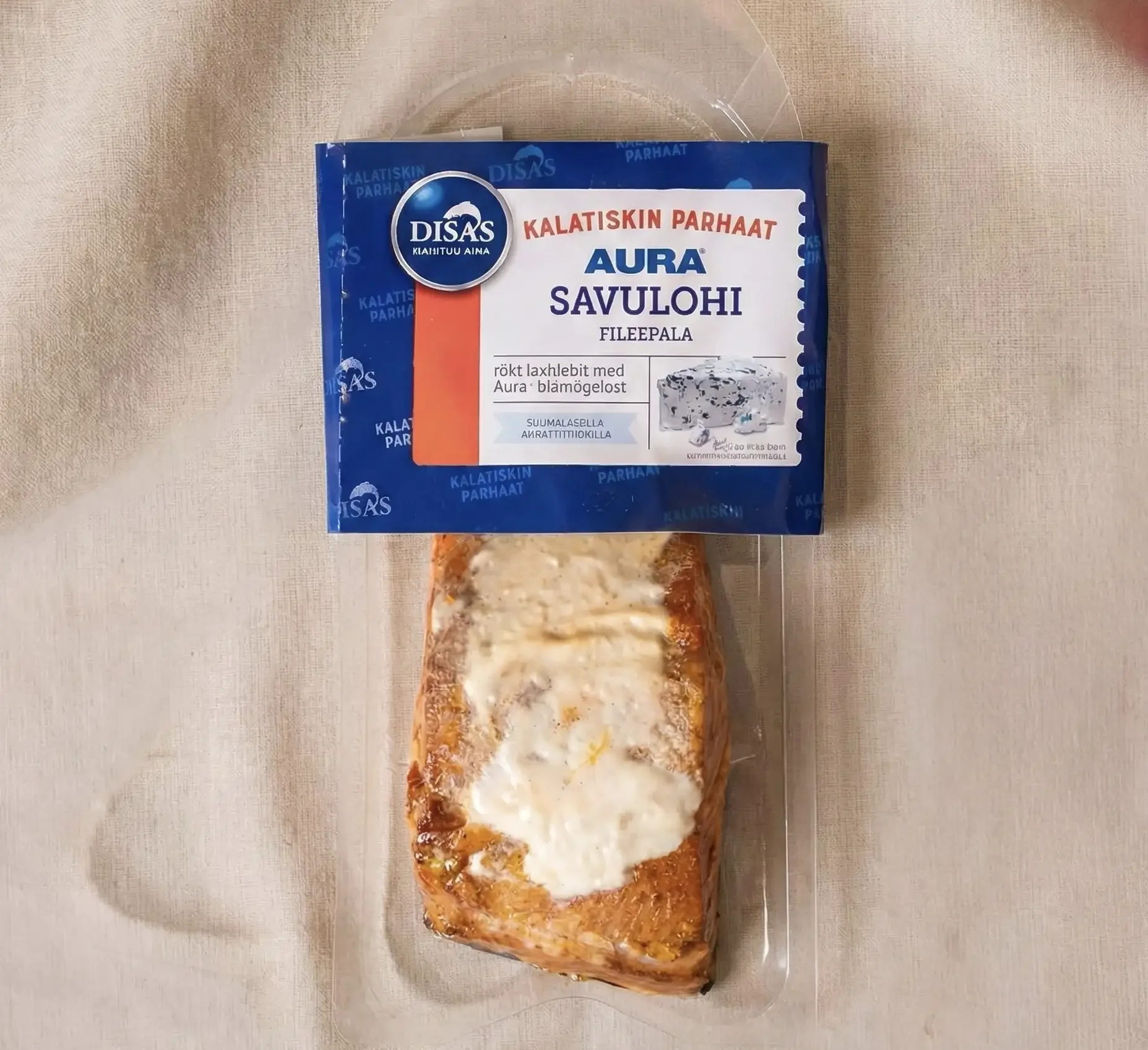 El Disas Aura Hot Smoked Salmon es una especialidad finlandesa muy apreciada que fusiona la calidad del salmón nórdico con el sabor distintivo del queso azul Aura, el queso más icónico de Finlandia.